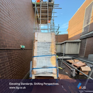 Accessing the upper roof level, approximately six meters above ground, required the deployment of a Geda Ladder Hoist. This specialist equipment enabled the secure vertical lifting of heavy HVAC units. Once on the roof, the units were moved across the surface on pallet trucks, with plyboard sheets protecting the roof membrane to facilitate smooth transit.